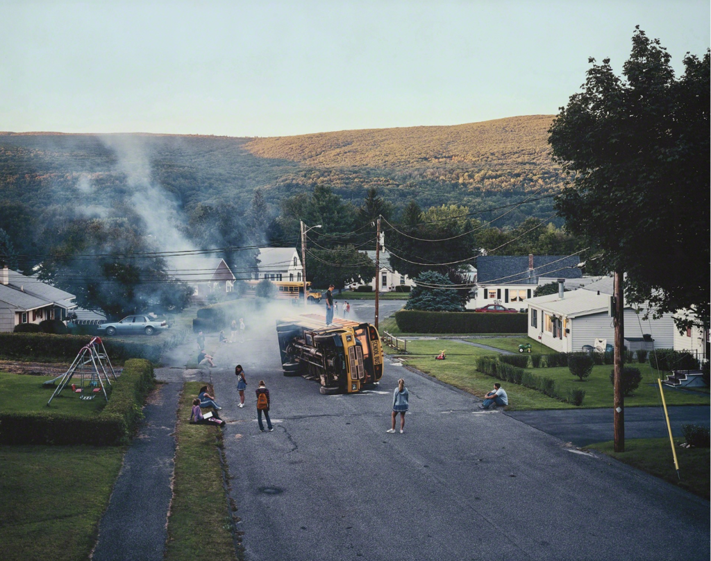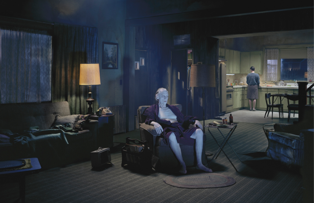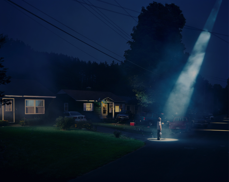 Gregory Crewdson captura, con sus fotografías de aire cinematográfico, la desidia, la inquietante extrañeza y la decadencia en el corazón de la América de provincias. Inspirándose en la obra de fotógrafos como William Eggleston y Diane Arbus, y en las películas fantásticas de Steven Spielberg y David Lynch, Crewdson planifica sus encuadres de gran formato con un detalle minucioso; a menudo recurre a grandes equipos humanos y material de rodaje para que las imágenes finales evoquen una fuerte sensación de narrativa y atmósfera. (Artsy).