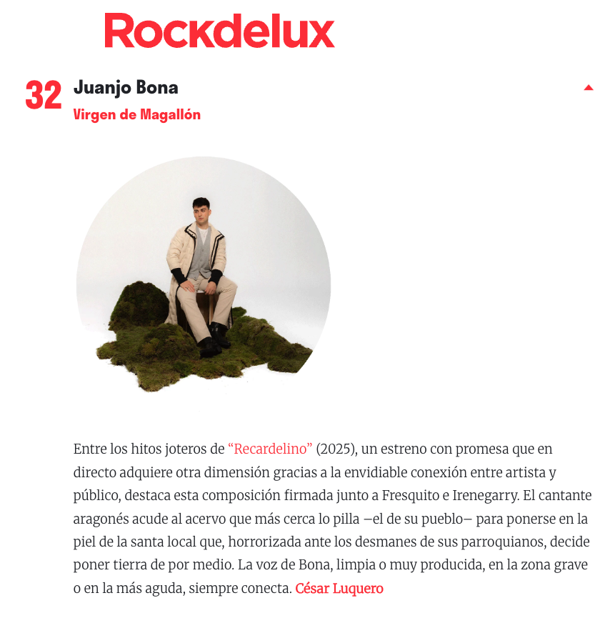 Estoy contento de que Rockdelux haya incluido en su lista de mejores canciones nacionales del año esta de Juanjo Bona (que podría estar incluso más arriba). A ver si se cuela también en su lista de álbumes, que todavía no ha salido. Una de las cosas que tengo pendientes de escribir es algo sobre ese (fantástico) disco, Recardelino, pero igual otro año será.